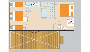 Spacious 3-bedroom mobile home (4.0 x 8.30 m) for up to 7 people. Perfect for larger families or couples travelling together. The open-plan living room and kitchen are modern and equipped with a 4-burner gas hob, microwave, tall fridge with freezer compartment, coffee machine and kettle. Everything is neatly stored in the many kitchen cupboards.
