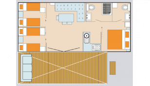 The spacious Superior Deluxe mobile home is ideal for larger families or couples travelling together, thanks to the third bedroom. The mobile home offers a spacious living room and open-plan kitchen. The modern kitchen is fully equipped, including a 4-burner gas hob, microwave, fridge-freezer and coffee machine.
