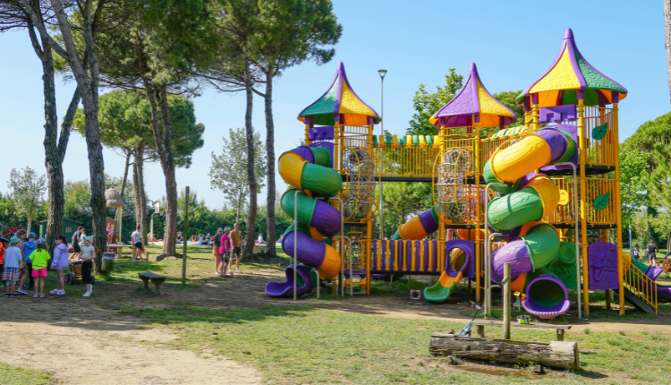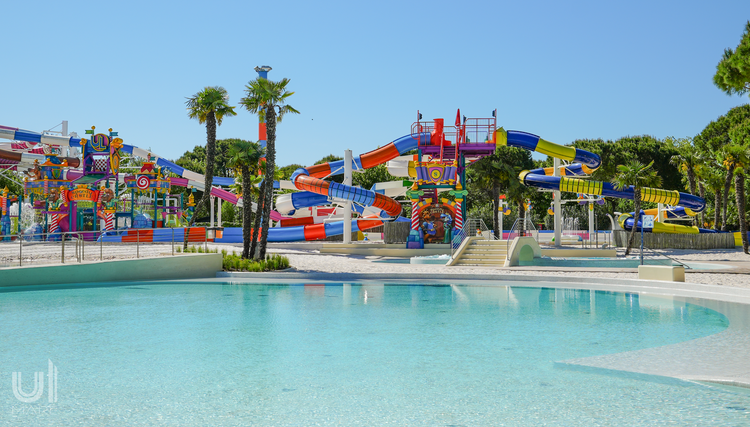 Union Lido Mare has been Italy's luxury campsite for years, with top facilities and two large water parks: Aqua Park Laguna and Speedy Island. Aqua Park Laguna is unique with white sand, palm trees, waterslides, a wave pool, and a spray park. Speedy Island is an innovative water park with a 10-meter-high slide, a lazy river through a themed village, a play castle, a spray park, and speedy falls.