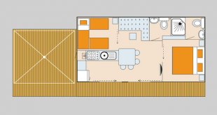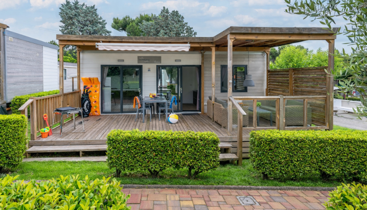 The mobile home has air conditioning and a large wooden terrace with luxury lounge set and canopy for maximum outdoor comfort.