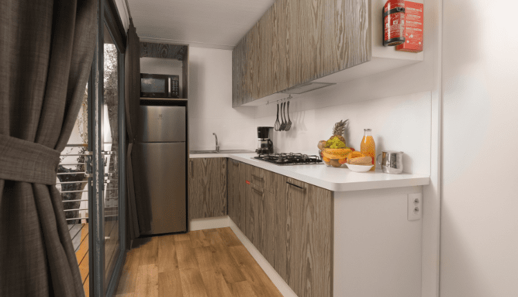 The Solare Deluxe offers luxury for 5 people. This mobile home has 2 bedrooms, plenty of storage space and a fully equipped kitchen with tall fridge and 4-burner gas hob. At the front is a wooden terrace with partial canopy, ideal during the hottest hours or during a rainstorm.