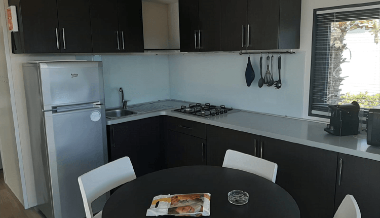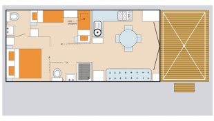 This mobile home specially designed for Gustocamp is luxuriously furnished and extra spacious (4.0 x 7.60 m), with a larger living kitchen and a sliding glass door that offers beautiful views. There are two bedrooms: one with a double bed and private toilet, and one with two single beds and a bunk bed.