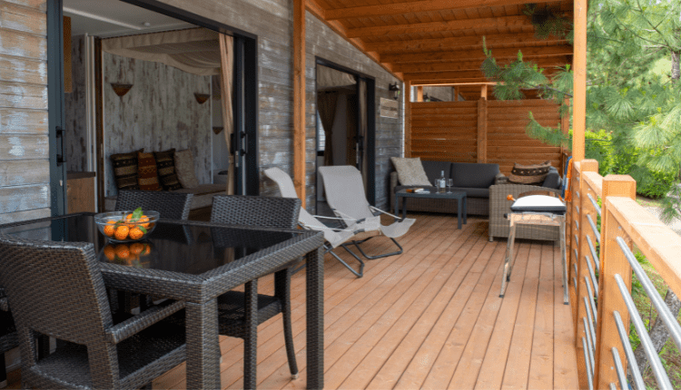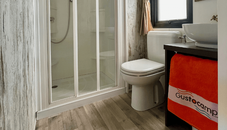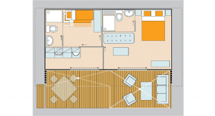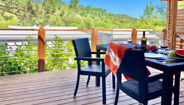 This spacious mobile home has two bedrooms and sleeps up to 5 persons. Each bedroom has its own bathroom en suite. You can either create one big living area or three separate rooms by opening/closing the sliding doors. It is up to you! Enjoy your holiday while drinking a glass of local wine on the wooden terrace in front of your mobile home.
