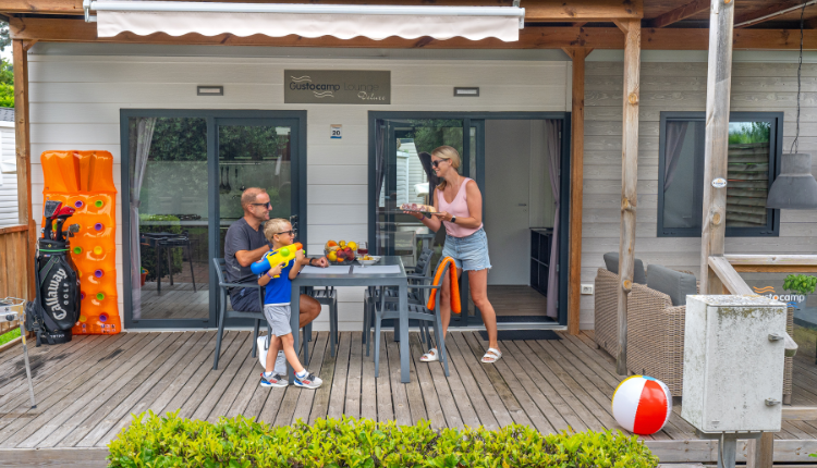 Outside, there is a wooden terrace with a (partially) covered roof. The terrace is equipped with complete garden furniture and a barbecue, allowing you to fully enjoy outdoor living, dine together, or relax after a day full of holiday activities.* On camping Union Lido, the toilet is in the shower room.