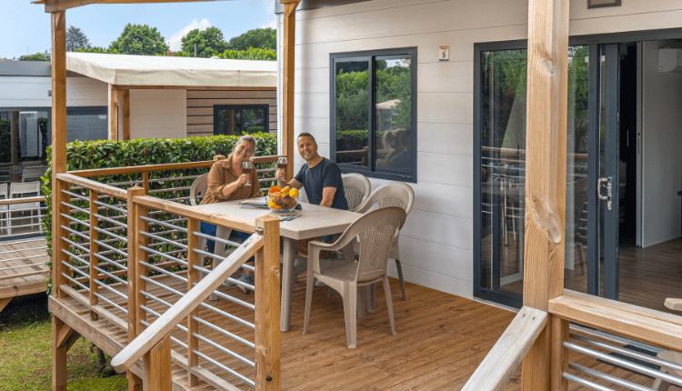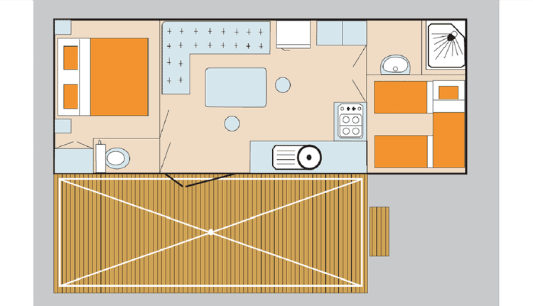 The mobile home with 2 bedrooms is a popular choice for families and couples who want to enjoy a comfortable camping holiday in Italy. These modern mobile homes are of high quality, luxuriously furnished, and fully equipped, allowing you to relax and enjoy a carefree stay. All 2-bedroom mobile homes are equipped with air conditioning as standard, ensuring pleasant temperatures during warm summer days. In addition, there is a comfortable covered terrace, perfect for outdoor dining or unwinding after a day full of holiday activities. The modern, fully equipped kitchen features a 4-burner gas hob, extractor hood, and a refrigerator with freezer compartment, making it easy to prepare your own meals and enjoy a delicious Italian dinner. Thanks to the two separate bedrooms, everyone has their own sleeping area and plenty of privacy, making this mobile home ideal for families with children.