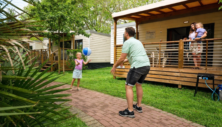 The spacious and comfortably furnished living area forms the central living space of the mobile home. Here you will find a cozy seating area, which can be used as a sofa bed for one additional person if desired. The fully equipped kitchen is ideal for a relaxing camping holiday in Italy and includes an extractor hood, coffee maker, electric kettle, microwave, and a tall refrigerator with freezer compartment. Thanks to the available air conditioning and heating, you can enjoy a pleasant indoor climate throughout the season.Bedrooms