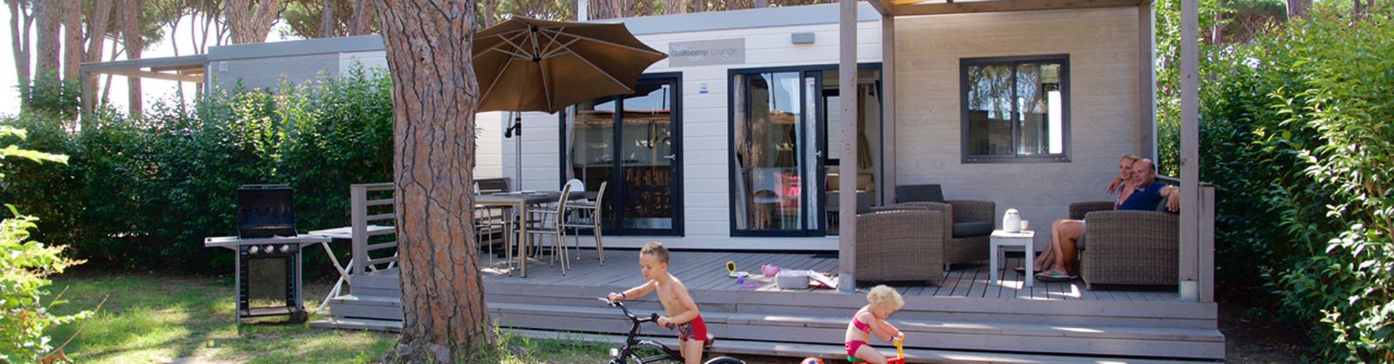 Our new mobile home, the Lounge Deluxe, is another new addition to our mobile home fleet and has a spacious and comfortable living/dining area with double doors opening onto the wooden terrace outside. This mobile home also has a shower room and separate toilet (en suite). There is a well equipped kitchen area with large American style fridge-freezer, gas hob and everything else you need for a enjoyable holiday, including air conditioning.